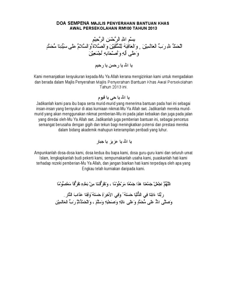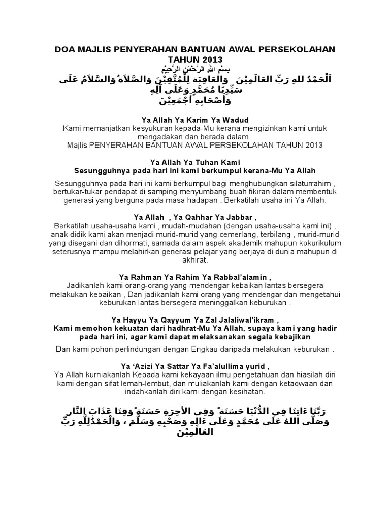 Doa Sempena Majlis Penyerahan Bantuan Khas Awal Persekolahan Pdf